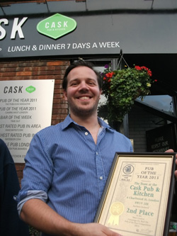 On a warm, almost summery, late June evening Pimlico's Cask Pub and Kitchen was alive and buzzy with a mainly young crowd of eclectic drinkers including CAMRA West London branch members. With a fine display of ten cask ales on hand pump and surrounded by appreciative members and customers, branch chair Les Maggs presented manager Steve Gray with the well-deserved certificate to add to the pub's roll of honour. Steve could barely restrain his enthusiasm, and a wide grin of delight broke through as he showed the certificate to the wider world!
